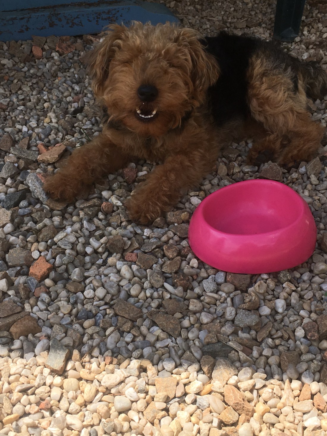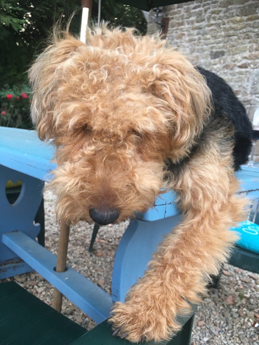 So Dylan was zooming around the garden, leaping up at Rich who was carrying a reluctant Wiglet to the pool, when disaster struck.
